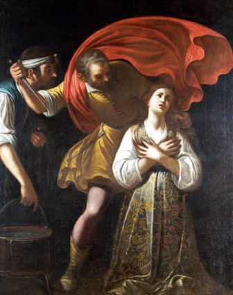 E’ così che Lucia inizia a dare i suoi averi e la sua dote ai poveri, aiutando le vedove e alcuni ministri del culto cristiano. Purtroppo il suo comportamento non passa inosservato agli occhi di un ragazzo che ha sperato di sposarla. Così, per vendetta della speranza delusa, il giovane denuncia Lucia come cristiana al prefetto di Siracusa. La donna viene portata davanti al tribunale, dove arriva serena e lieta in volto. Pascasio, il prefetto, sapendo che è nobile, ricca e vedendola così bella, dapprima la tratta con gentilezza. Quando Pascasio comprende che Lucia non avrebbe rinuncia alla sua fede cristiana ordina che sia trascinata in un luogo di perdizione. E’ allora che avviene un prodigio: lo Spirito Santo fa in modo che Lucia sia inamovibile. Provano a trascinarla i più forti soldati, provano a legarla mani e piedi e a tirare tutti insieme, alla fine si tenta anche con un paio di buoi: ma nulla. La ragazza resta dov’è. Il prefetto arrabbiato e convinto che il prodigio possa essere solo opera di una strega, ordina che sia arsa viva sul posto. Ma le fiamme non hanno presa sulle vesti e sulla persona di Lucia. Alla fine, accecato dalla rabbia, Pascasio fa uccidere Lucia con un pugnale.