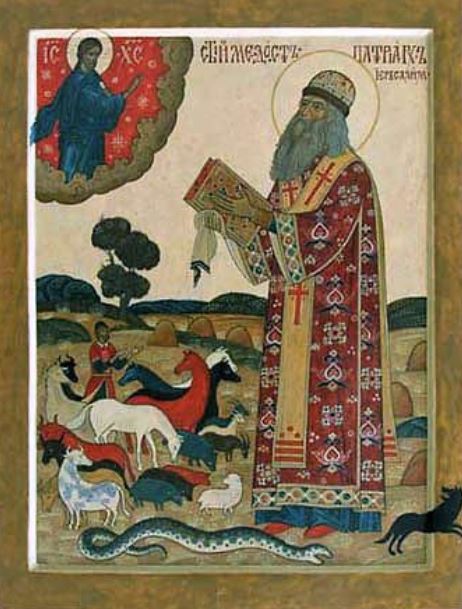 Modesto nasce a Sebaste in Cappadocia (Asia Minore) da una famiglia cristiana: la sua attività sarà intimamente legata agli avvenimenti che finiranno per turbare dolorosamente la Palestina agli inizi del VII secolo. Fin da giovane Modesto si sente attratto dalla vita monastica più rigorosa e così prende i voti monastici. Vive nel monastero fondato nel IV secolo da San Teodosio in Palestina. A quel tempo la Siria e la Palestina nel 614 vengono attaccate dall’esercito del re persiano Cosroe, che in alleanza con gli ebrei, distrugge numerose chiese cristiane e 94.000 cristiani vengono trucidati. A Gerusalemme il Patriarca Zaccaria e molti cristiani sono fatti prigionieri e come bottino di guerra viene trafugata anche la Croce del Signore.