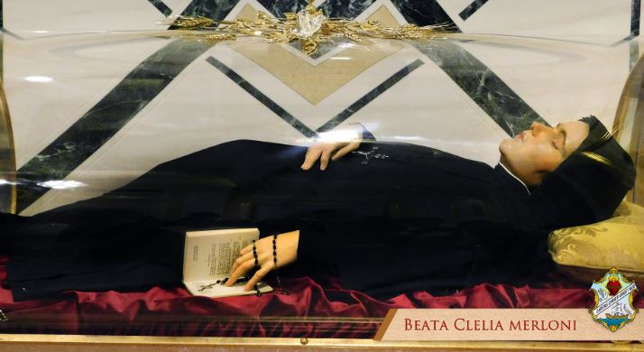 La futura Beata nasce a Forlì il 10 marzo 1861, figlia di Gioacchino Merloni e Maria Teresa Brandinelli. A ventidue anni entra tra le Figlie di Nostra Signora della Neve, ma deve uscirne per motivi di salute prima ancora dei voti temporanei. Dopo un’esperienza a Genova come direttrice di un orfanotrofio, entra in contatto con le Figlie della Divina Provvidenza, fondate da San Luigi Guanella. Nel 1893 è colpita dalla tubercolosi: mentre viene giudicata in fin di vita, capisce che Dio vuole da lei un’opera dedicata al Sacro Cuore di Gesù. Nel 1894, insieme a una compagna, si dirige a Viareggio, dove muoveranno in seguito i primi passi le suore della sua congregazione. Finita in miseria a causa dell’amministratore dei beni ereditati dal padre, Clelia, ormai Madre fondatrice, è aiutata dal Beato Giovanni Battista Scalabrini, vescovo di Piacenza e fondatore dei Missionari di San Carlo, che sta per creare un’analoga istituzione femminile.