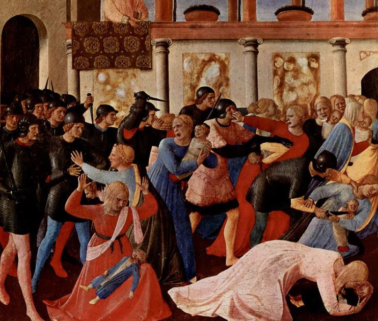 Nel XII secolo, a Parigi, il nome degli Innocenti viene dato ad una chiesa e al cimitero adiacente ad essa, entrambi poi rasi al suolo verso la fine del XVIII secolo. Sono peraltro innumerevoli le opere che, dall’arte alto medievale al barocco, hanno come soggetto la strage degli innocenti. Tra queste la scena che Duccio da Buoninsegna ci offre nella tavola (1308-1311) del Museo dell’Opera del Duomo in Siena. Il contrasto formidabile tra la ferocia del potere politico e la tenerezza per gli affetti delle madri dà forma alla scena raffigurata nell’affresco di Giotto (ca. 1304-1306) della Cappella degli Scrovegni a Padova. In alto, su una tribuna, Erode ordina il massacro che i suoi sicari intabarrati eseguono con freddo cinismo e scrupolo; a fronte di essi, madri dolenti invocano inutilmente pietà, mentre si oppongono fisicamente e coraggiosamente all’eccidio. Altri affreschi celebri sono quelli del Ghirlandaio e del Beato Angelico.