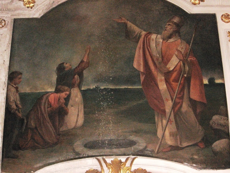 Secondo fonti storiche non confermate è lui il successore di Eustasio nella guida della diocesi. Un racconto leggendario compilato nel XIII secolo gli attribuisce l’invenzione (cioè la scoperta) in Palestina del capo di San Giovanni Battista, gettato in un pozzo dopo che Salomè, istigata dalla madre Erodiade l’ha fatto decapitare. Non a caso, l’iconografia lo rappresenta con le insegne episcopali, mentre regge il capo reciso di San Giovanni Battista, spesso anche nell’atto di far precipitare la grandine in un pozzo o di calmare gli elementi naturali scatenati. E’ stato indicato come protettore dei raccolti dalle tempeste, specie dalla grandine.