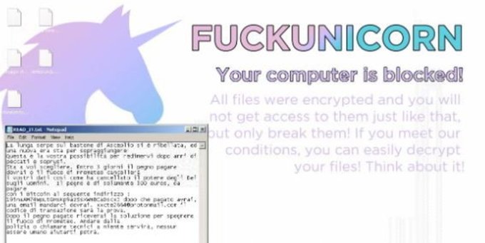 Una volta scaricato il file il malware provvede a cifrare i file presenti sul sistema Windows della vittima e a rinominarli assegnando l’estensione “.fuckunicornhtrhrtjrjy”. Alla fine dell’operazione viene mostrato il contenuto di un file di testo con le istruzioni per il pagamento del riscatto: viene richiesto di pagare 300 euro in bitcoin per liberare i file cifrati. Sulla truffa telematica sta indagando la polizia postale