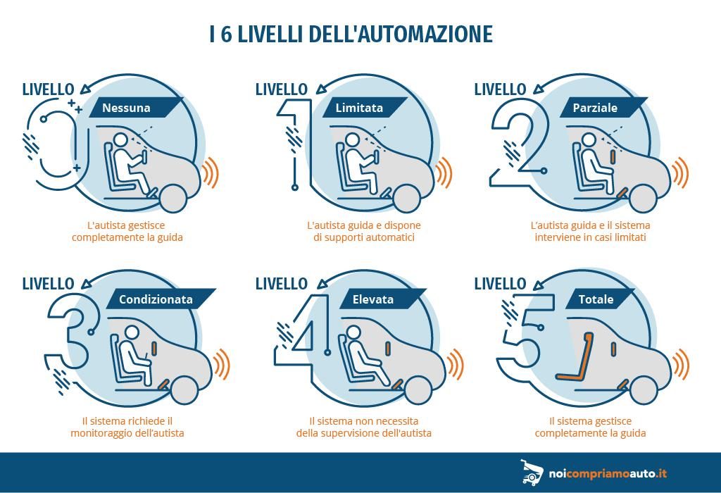 Questo progetto, che coinvolge molte case automobilistiche è ancora in fase di sviluppo e ricerca, possiamo però già notare la presenza di qualche accenno di automazione già oggi sulle nostre vetture, come i sistemi di sicurezza dedicati alla frenata di sicurezza, al parcheggio assistito e al cruise control. Per essere più chiari quindi sarebbe bene fare una distinzione su quelli che sono i vari step dell’automazione, partendo dal livello zero fino al sesto ovvero la totale autonomia. Ogni livello, ad ordine crescente riduce sempre di più l’intervento umano nel traffico.