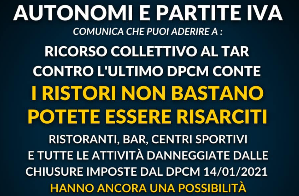 Dello stesso avviso l’iniziativa promossa ora da Autonomi e Partiva Iva che hanno deciso di fare un ricorso collettivo al Tar contro l’ultimo DPCM Conte, che, dicono, ha messo ‘in ginocchio’ molte categorie. I ristori non bastano, potete essere risarciti, cita il ‘manifestino’, diffuso sui social, che invita a partecipare numerosi ed i riferimenti per poterne prendere attivamente parte.