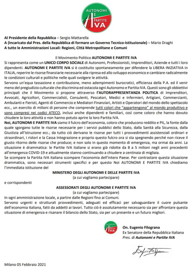 Sulla pagina social ‘Autonomi e partita Iva’ vi é in primis la lettera al Presidente Mattarella e a Mario Draghi in cui si spiegano le finalità del partito, a firma dell’onorevole Eugenio Filograna, e si chiede venga istituito un Ministero degli autonomi e delle partite Iva. Per quanto riguarda l’iniziativa di cui vi abbiamo parlato in apertura i riferimenti sono visibili al link https://autonomiepartiteiva.org/ricorso-al-tar/ , ove é possibile compilare il format per prendere parte al ricorso e ove si precisa però che ‘ L’Associazione NOI AUTONOMI E PARTITE IVA svolge solo un’attività di segnalazione e non parteciperà in alcun modo all’attività legale né ha alcun ritorno economico”.