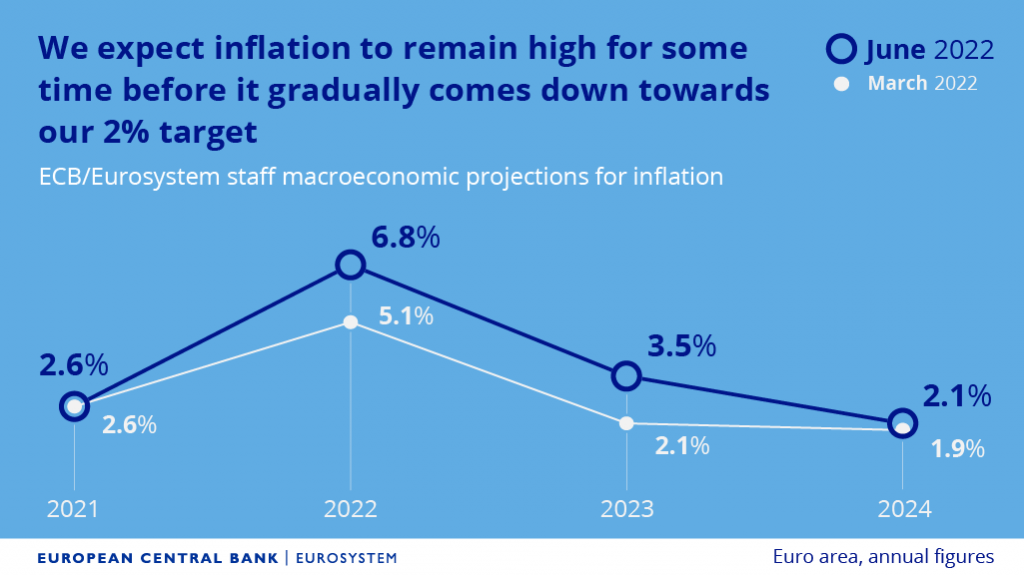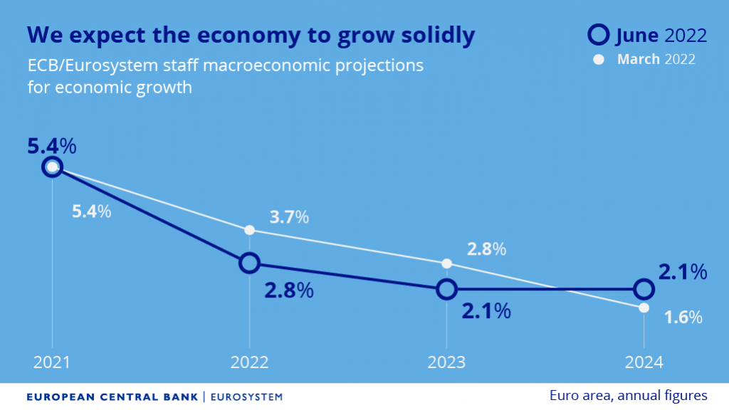 Lo stesso andamento è previsto per l’aumento del pil. Le stime aggiornate sono negative rispetto a quelle di inizio guerra in Ucraina. Ma, scrive ancora la Bce, “Ci aspettiamo una solida crescita economica“.