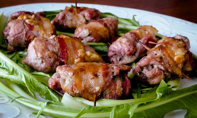 Ingredienti (per 4 persone). 12 fette di capocollo fresco di maiale; 400 gr. pancetta; 400 gr. caciocavallo;prezzemolo q.b., olio extravergine d’oliva q.b.; 1 spicchio d’aglio; sale; pepe nero.