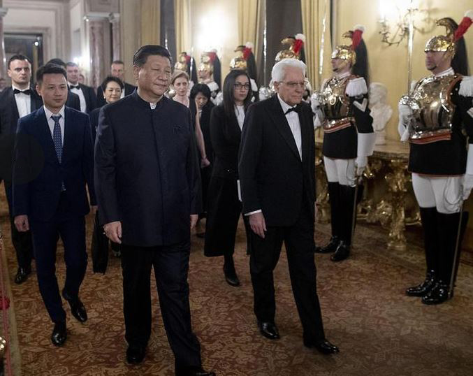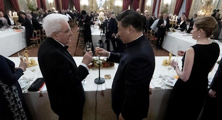 La giornata di Xi e Peng si è conclusa con una cena di gala italiana chiusa dalla musica di Andrea Bocelli. Nel menù del pranzo di Stato, tortelli ripieni di carbonara, vitello al tartufo e, come dessert, babà alla frutta. Due le tavolate allestite per la coppia presidenziale e gli altri 170 invitati: la prima a forma di un lunghissimo ferro di cavallo che occupava tutto il perimetro della sala e la seconda posta all’interno della prima, al centro del Salone delle Feste