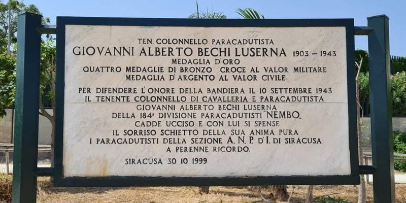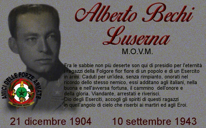 Il Tenente Colonnello Alberto Bechi Luserna, valoroso ufficiale, Capo di Stato Maggiore della divisione paracadutisti “Nembo”, morì in Sardegna a Macomer, il 9 settembre 1943 . Figlio di Giulio Bechi, anch’egli ufficiale e scrittore, e di Albertina Luserna dei conti di Campiglione e Luserna, apparteneva a famiglia tosco-piemontese di tradizione militare.