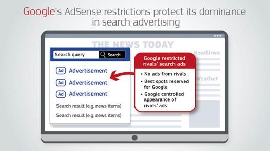 Spesso i siti web di quotidiani, i blog o gli aggregatori di siti di viaggio sono dotati di una funzione di ricerca. Quando un utente effettua una ricerca utilizzando questa funzione, insieme ai risultati della ricerca, il sito web propone annunci pubblicitari collegati alla ricerca. Google attraverso il sistema AdSense for Search fornisce questi annunci ai proprietari dei siti “publisher”, agendo in veste da intermediario tra inserzionisti e proprietari di siti web. Con una quota di mercato superiore al 70 %, tra il 2006 e il 2016 Google è stato di gran lunga l’attore più forte nell’intermediazione pubblicitaria nei motori di ricerca nello Spazio economico europeo . Inoltre nel 2016 ha detenuto quote superiori al 90 % nei mercati nazionali della ricerca generica e superiori al 75 % nella maggior parte dei mercati nazionali della pubblicità collegata alle ricerche sul suo motore di ricerca. In questa maniera concorrenti del settore come Microsoft e Yahoo, non hanno avuto la reale possibilità di vendere spazi pubblicitari nelle pagine dei risultati di ricerca di Google, i siti web di terzi hanno rappresentato e rappresentano ancora oggi un buon modo per entrare a concorrere nel settore pubblicitario sul web. Attraverso un’accurata indagine, esaminando centinaia di accordi con i propri clienti, la Commissione Ue ha appurato che Google ha intrapreso pratiche scorrente nei confronti dei concorrenti.
