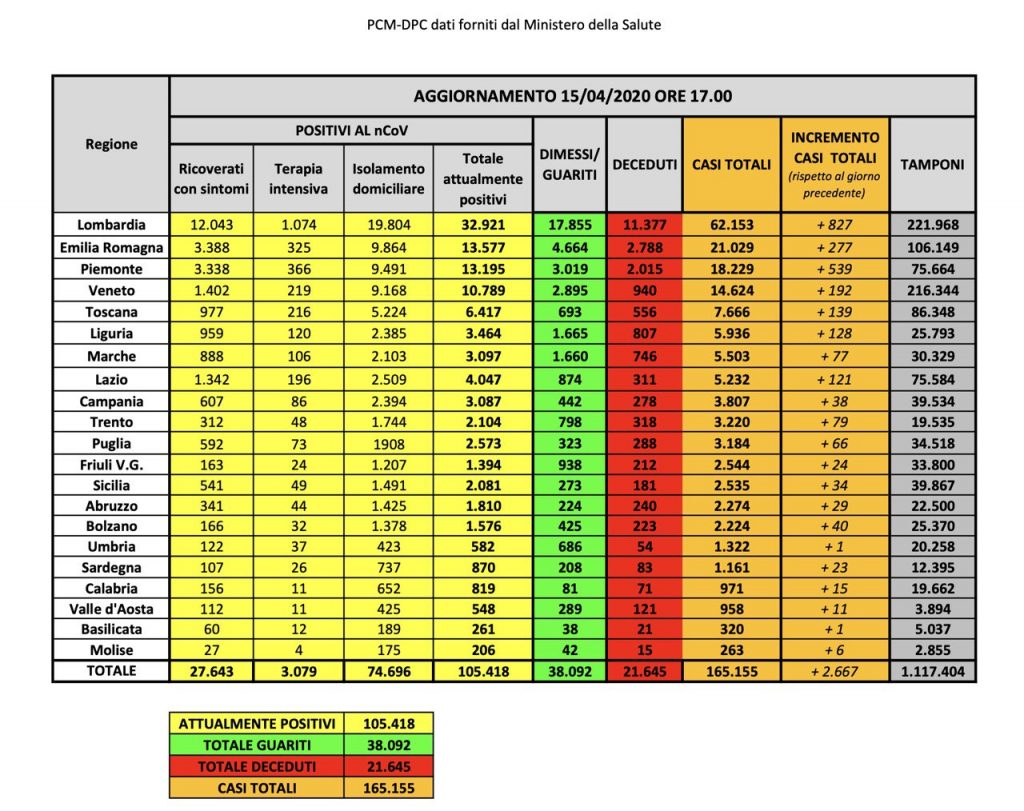 Il numero delle vittime da inizio emergenza sale a 21.645, nella giornata di ieri ci sono stati 578 decessi, in leggera diminuzione rispetto ai 602 di ieri. Mentre sono 38.092 le persone guarite in Italia dopo aver contratto il coronavirus, 962 più di ieri. Ieri l’aumento dei guariti era stato di 1.695.