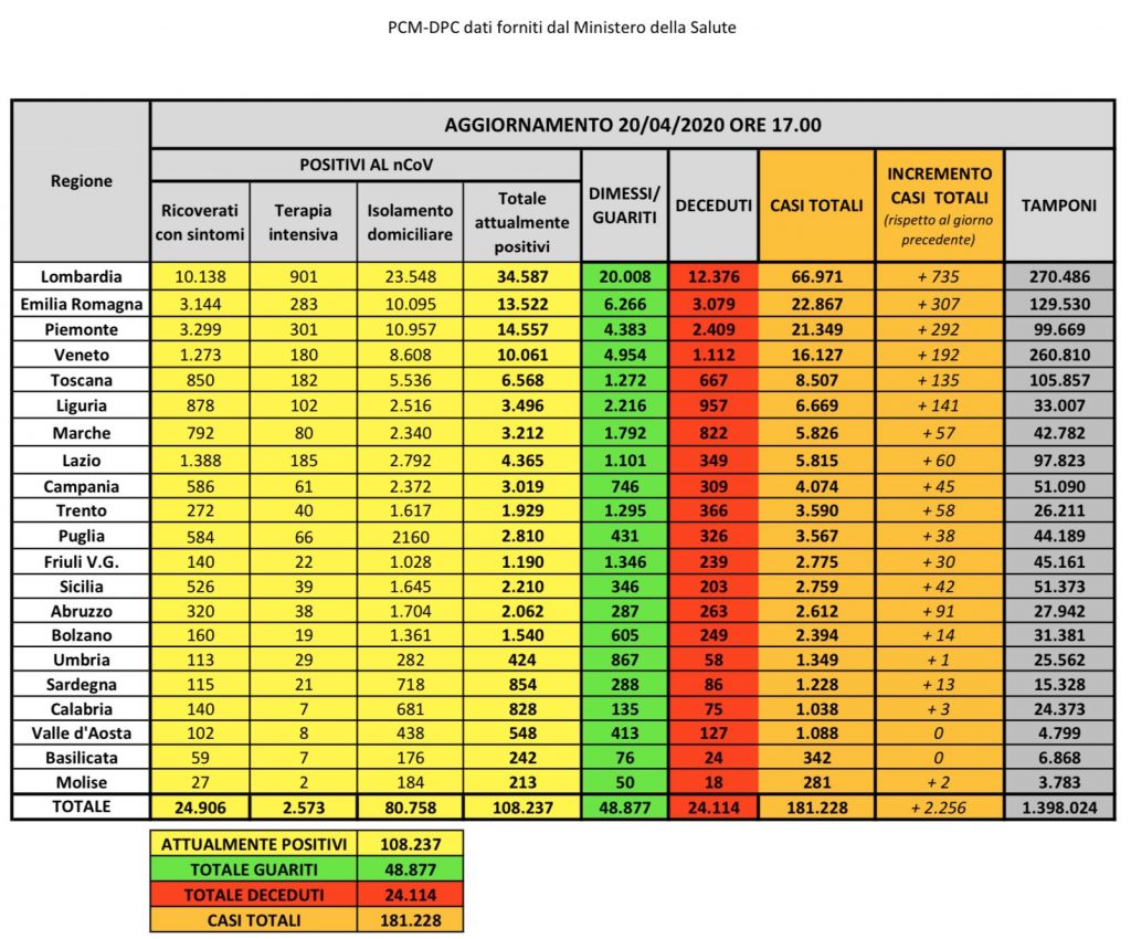 Per la prima volta dall’inizio dell’emergenza il numero degli attualmente positivi al Coronavirus è in calo rispetto al giorno prima: il numero dei contagiati totali in Italia, comprese vittime e guariti, è di 181.228, con un incremento rispetto a ieri di 2.256. Il dato è stato reso noto nel corso della conferenza stampa dal capo della Protezione civile, Angelo Borrelli. Ad oggi sono complessivamente 108.237 i malati in Italia mentre ieri erano 108.257, dunque 20 in più. Ieri l’aumento era stato di 486 rispetto al giorno precedente.