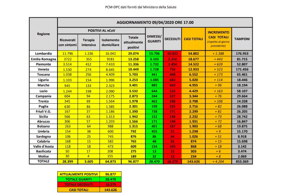 za stampa presieduta dal commissario per l’emergenza Angelo Borrelli. Il numero dei contagiati totali dal virus Covid-19 in Italia – compresi morti e guariti – è di 143.626, con un incremento rispetto a ieri di 4.204