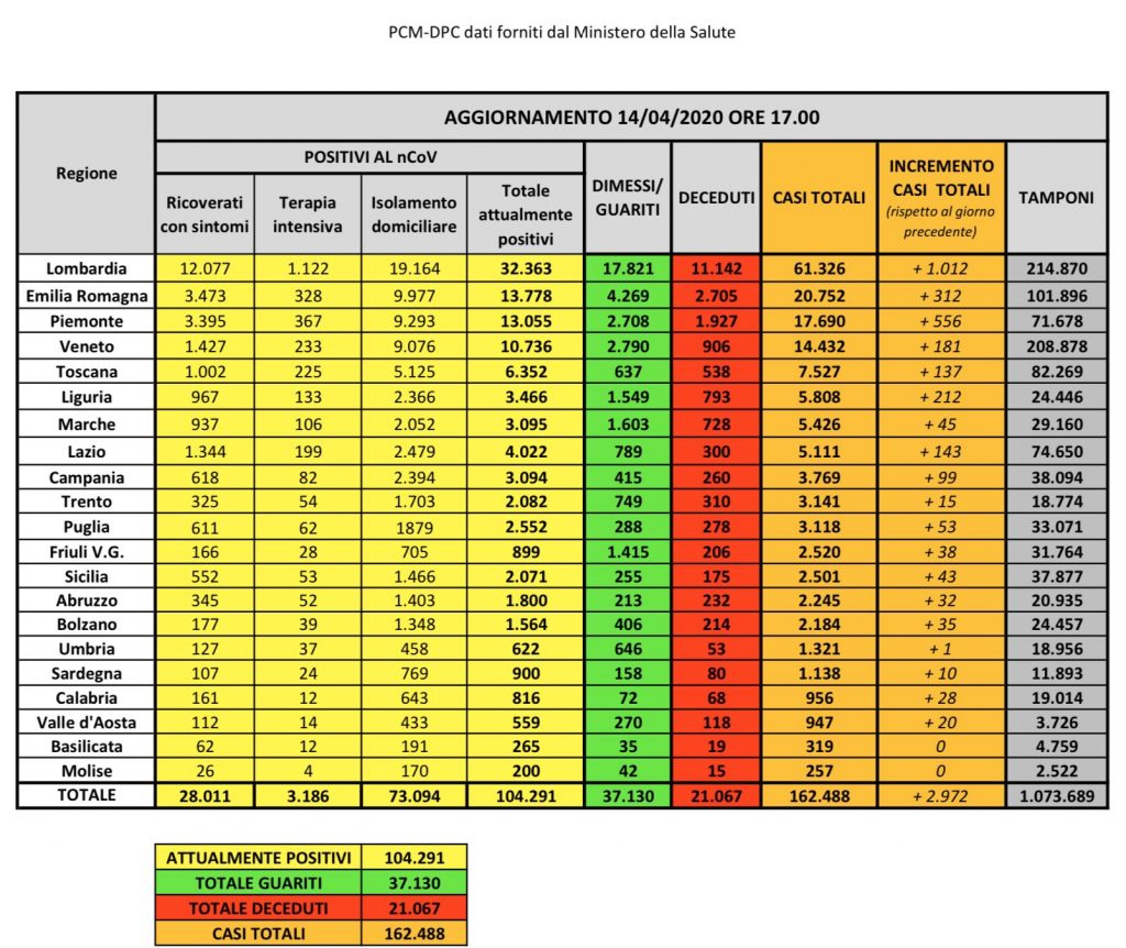 Ad oggi, in Italia sono stati 162.488 i casi totali. Nel dettaglio: i casi attualmente positivi sono 32.363 in Lombardia, 13.778 in Emilia-Romagna, 13.055 in Piemonte, 10.736 in Veneto, 6.352 in Toscana, 3.466 in Liguria, 3.095 nelle Marche, 4.022 nel Lazio, 3.094 in Campania, 2.082 nella Provincia autonoma di Trento, 2.552 in Puglia, 899 in Friuli Venezia Giulia, 2.071 in Sicilia, 1.800 in Abruzzo, 1.564 nella Provincia autonoma di Bolzano, 622 in Umbria, 900 in Sardegna, 816 in Calabria, 559 in Valle d’Aosta, 265 in Basilicata e 200 in Molise.