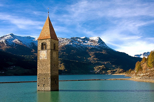 Spesso sono poche, a volte una sola, le testimonianze della presenza di una comunità. Nel caso di Curon questa presenza è testimoniata dal campanile. Tutto ciò che è rimasto.