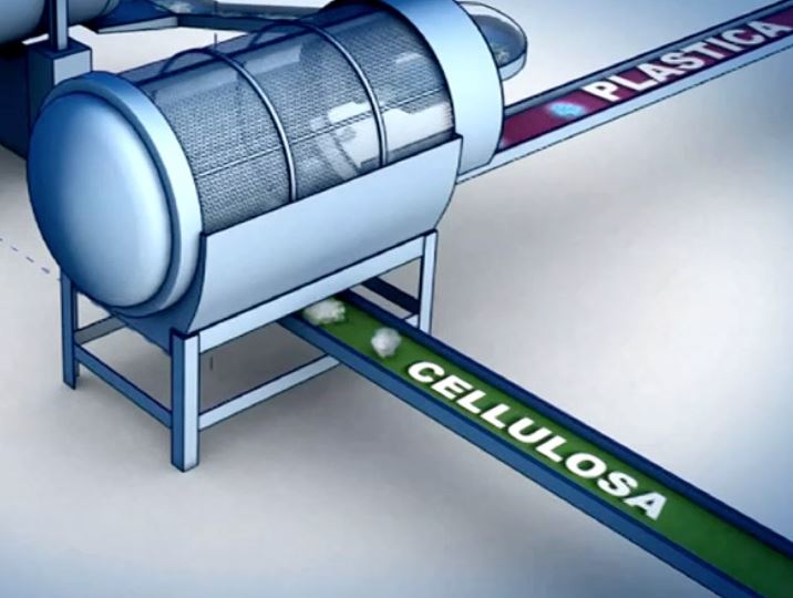 Fase finale.Una batteria di separatori in serie, attraverso un sistema di cilindri rotanti, separa e recupera le materie prime seconde. Da ogni tonnellata di questi rifiuti si ottengono 150 kg di cellulosa, 75 kg di plastica e 75 kg di polimero super assorbente.