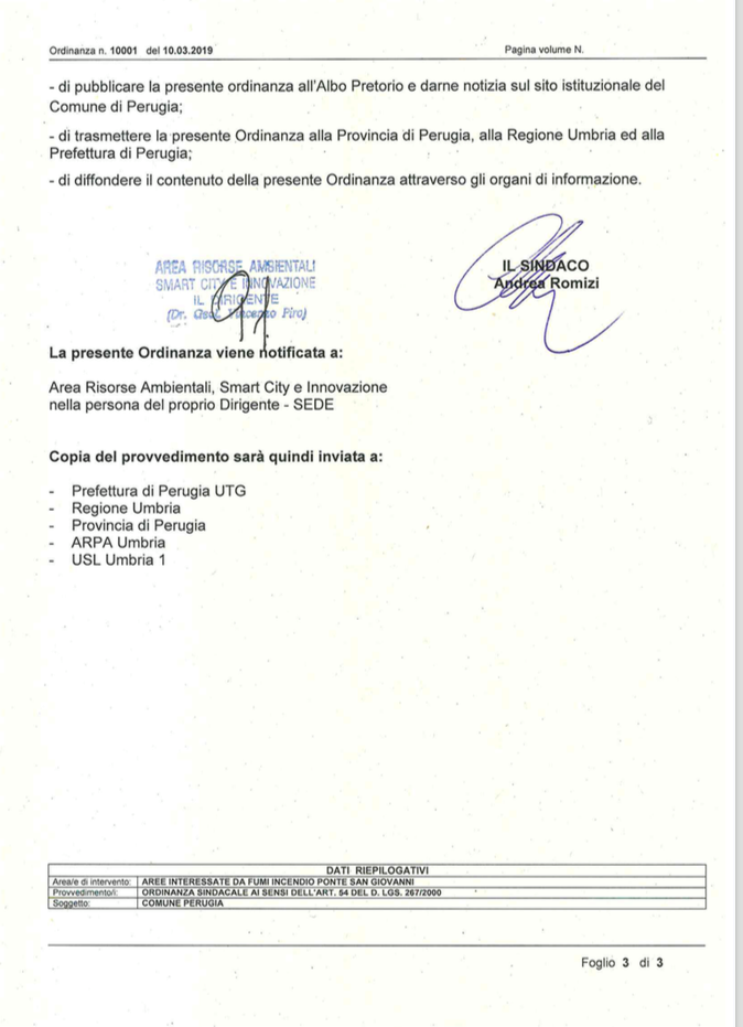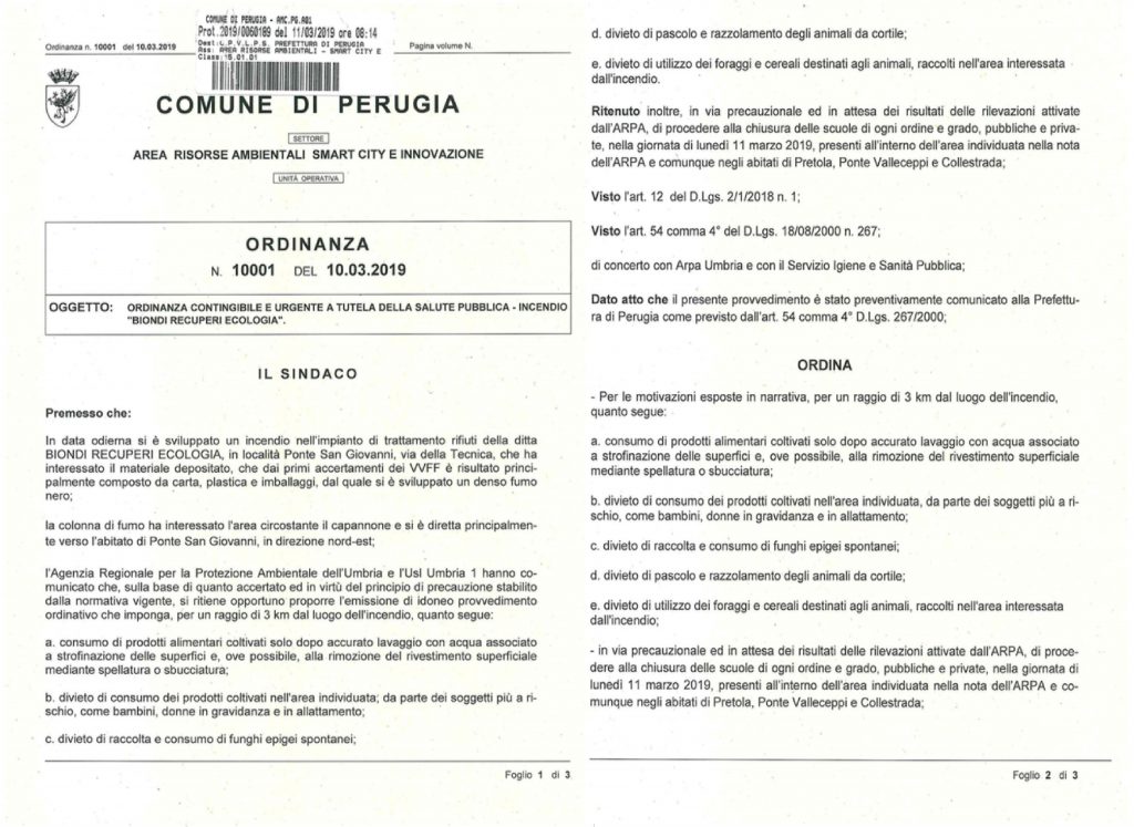 Il Comune di Perugia ha emesso quanto segue: “Ordinanza contenibile e urgente a tutela della salute pubblica – incendio Biondi recuperi ecologia” a seguito dei primi accertamenti dei Vvf, di Arpa e Usl Umbria 1 che impone, in via precauzionale, una serie di accorgimenti dal punto di vista alimentare nel raggio di tre chilometri dall’incendio, oltre alla chiusura delle scuole.