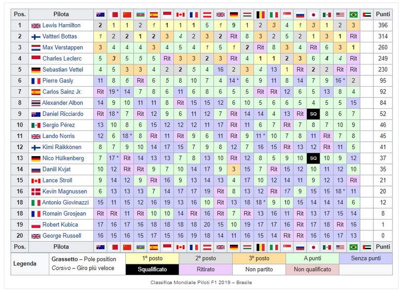 La classifica piloti dopo il Gp del Brasile