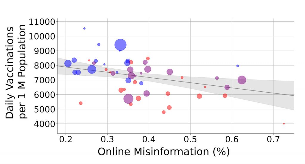 Milano. La disinformazione online risulta essere uno dei maggiori aspetti che hanno influenzato la campagna vaccinale statunitense contro il COVID19. È quanto emerge da uno studio pubblicato da Nature Scientific Reports curato da Francesco Pierri, ricercatore del Politecnico di Milano, in collaborazione con l’Indiana University nell’ambito del progetto Horizin 2020 Periscope. L’obiettivo di questo studio è mostrare se ci siano o meno delle associazioni statisticamente significative tra la qualità dell’informazione consumata online e il sentimento “no-vax” della popolazione statunitense, con conseguenti ricadute sulla campagna vaccinale. Lo studio ha confermato un’associazione statisticamente significativa tra la quantità di disinformazione condivisa online e la tendenza a rifiutare o ritardare il vaccino negli Stati Uniti. In particolare, negli stati e nelle contee in cui viene consumata più disinformazione online si registrano livelli più alti di esitazione vaccinale e, conseguentemente, livelli più bassi di copertura vaccinale. Dall’inizio del 2021, i ricercatori del Politecnico di Milano e dell’Observatory on Social Media (OSOME) hanno raccolto milioni di post condivisi su Twitter e relativi ai vaccini, con l’obiettivo di studiare gli effetti delle informazioni inattendibili e/o inaccurate sulla campagna vaccinale statunitense iniziata alla fine del 2020. Utilizzando una lista di siti di notizie etichettati da giornalisti, factcheckers e altri accademici come portali che diffondono notizie false e inattendibili, i ricercatori hanno individuato milioni di post dal contenuto potenzialmente dannoso (e.g., articoli che dichiarano che i vaccini non funzionano o causano la morte) condivisi da milioni di utenti Twitter nei primi mesi del 2021 che si erano geolocalizzati nei vari stati e contee degli Stati Uniti.