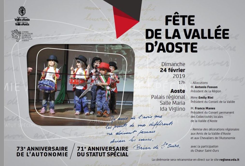 AOSTA. La Valle d’Aosta si prepara a celebrare la sua festa. Nell’occasione, domani, domenica 24, saranno commemorati due anniversari che hanno segnato la storia della Regione: il 73° dell’Autonomia e il 71° dello Statuto speciale. Istituita nel 2006 con una legge regionale, la Festa della Valle d’Aosta vuole valorizzare l’autonomia della Regione, con particolare attenzione alle giovani generazioni: da una lato illustrando e valorizzando il patrimonio linguistico, sociale, culturale e identitario, dall’altro affermando i valori e le tradizioni della comunità valdostana.