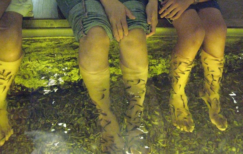 Questi pesci sono conosciuti con il nome di Garra Rufa, alcuni li soprannominano anche “pesci dottore”, diffusi nelle acque dolci del sud della Turchia. Si tratta di pesci privi di denti che utilizzano la loro piccola bocca a ventosa per cibarsi delle cuticole dei piedi.