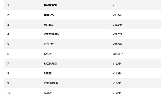 Ottima la prestazione di Verstappen, quarto, che alla fine ha avuto la meglio sul ferrarista Leclerc. Sesta piazza per Gasly che proprio nel finale ha fatto registrare il giro più veloce, rosicchiando quel punticino nella classifica piloti che fino a quel momento era riuscito a mettere nel carniere Vettel. Indietro le Alfa: nono Raikkonen e quindicesimo Giovinazzi. Ritiri per Norris, Kvyat e Hulkenberg.