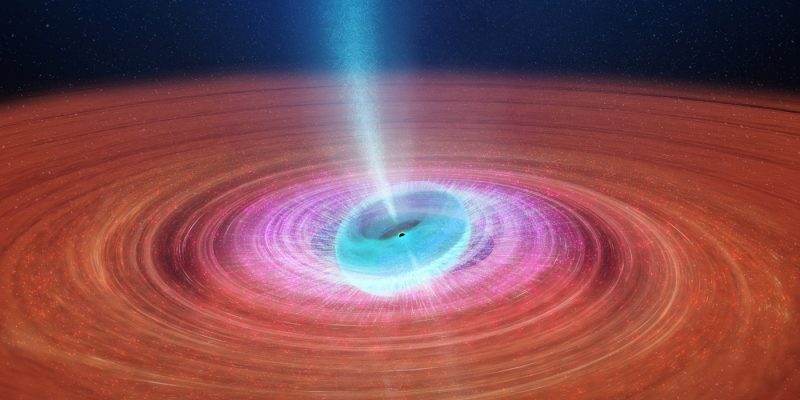 Nel processo di accrescimento del buco nero, una piccola porzione di materiale viene espulsa violentemente a velocità prossime a quella della luce in potenti e luminosi getti di plasma caldo, che formano due colonne lungo l’asse di rotazione del buco nero.