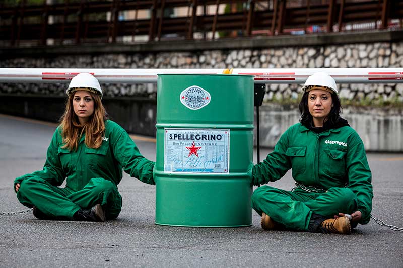 SAN PELLEGRINO TERME. Questa mattina gli attivisti di Greenpeace nella località di Ruspino, in provincia di Bergamo, si sono incatenati davanti all’ingresso della fabbrica di imbottigliamento di Nestlé / San Pellegrino. L’iniziativa si inquadra nella giornata globale di azioni condotte da Greenpeace, e dalle altre organizzazioni della coalizione Break Free From Plastic, presso il quartiere generale della multinazionale a Vevey, in Svizzera, e presso gli uffici e siti produttivi di Nestlé in Slovenia, Kenya, Germania e Filippine.