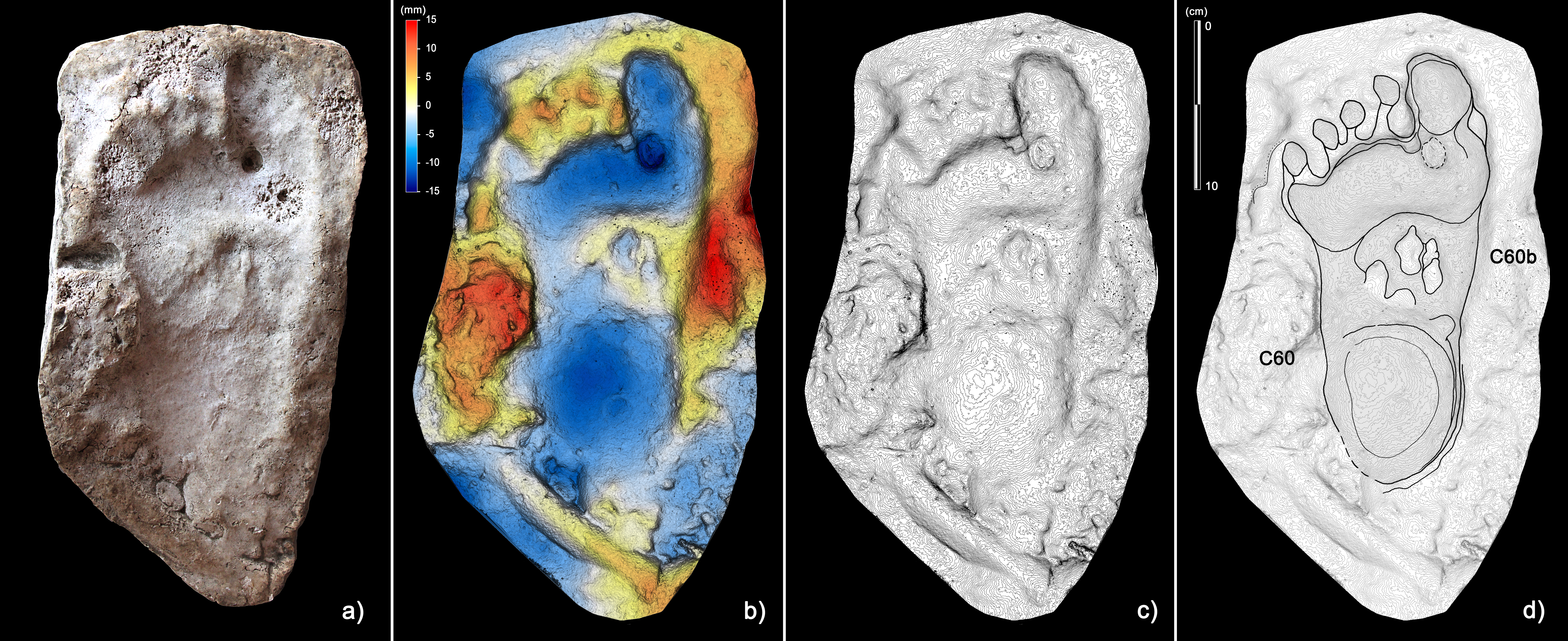 Orme appaiate di uno stesso individuo (C61 e C63) che si era fermato accucciato nel corridoio delle impronte. a) calco in gesso eseguito poco dopo la scoperta negli anni ’50 del secolo scorso; b) modello digitale realizzato mediante laser HDI 3D Scanner in laboratorio MUSE 3d; c) Elaborazione con curve di livello; d) schizzo interpretativo delle orme umane con evidenziata una terza orma mal preservata (elab. Isabella Salvador e Marco Avanzini).