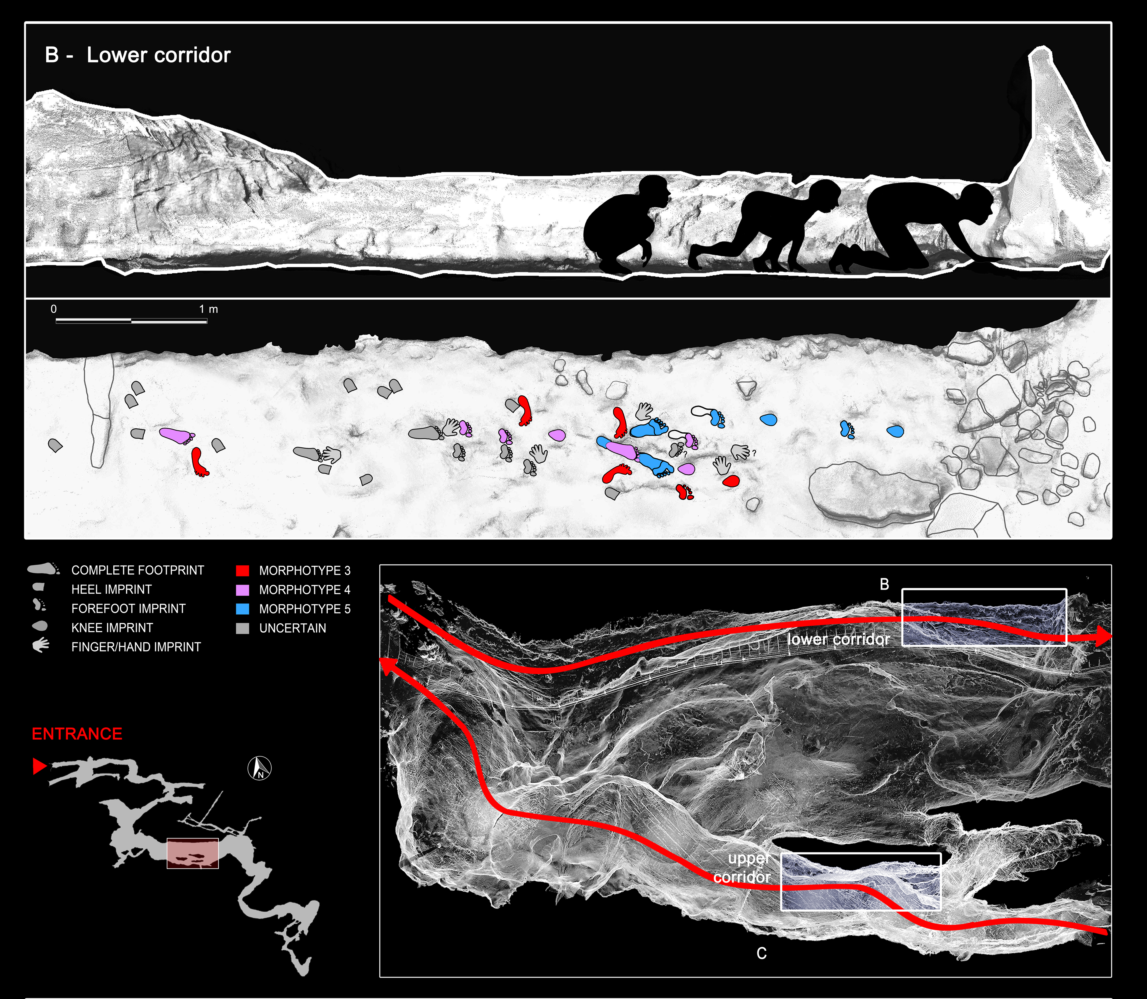 Una seconda fase della ricerca, condotta sulle orme presenti lungo il ‘Corridoio delle impronte’ tra 2017 e 2018, ha rivelato che i tre bambini erano affiancati da due adulti, alti tra 150 e 167 cm, i quali avevano tracciato la via lungo i tortuosi cunicoli di accesso, attraversando stretti passaggi obbligati e procedendo a carponi per lunghi tratti.