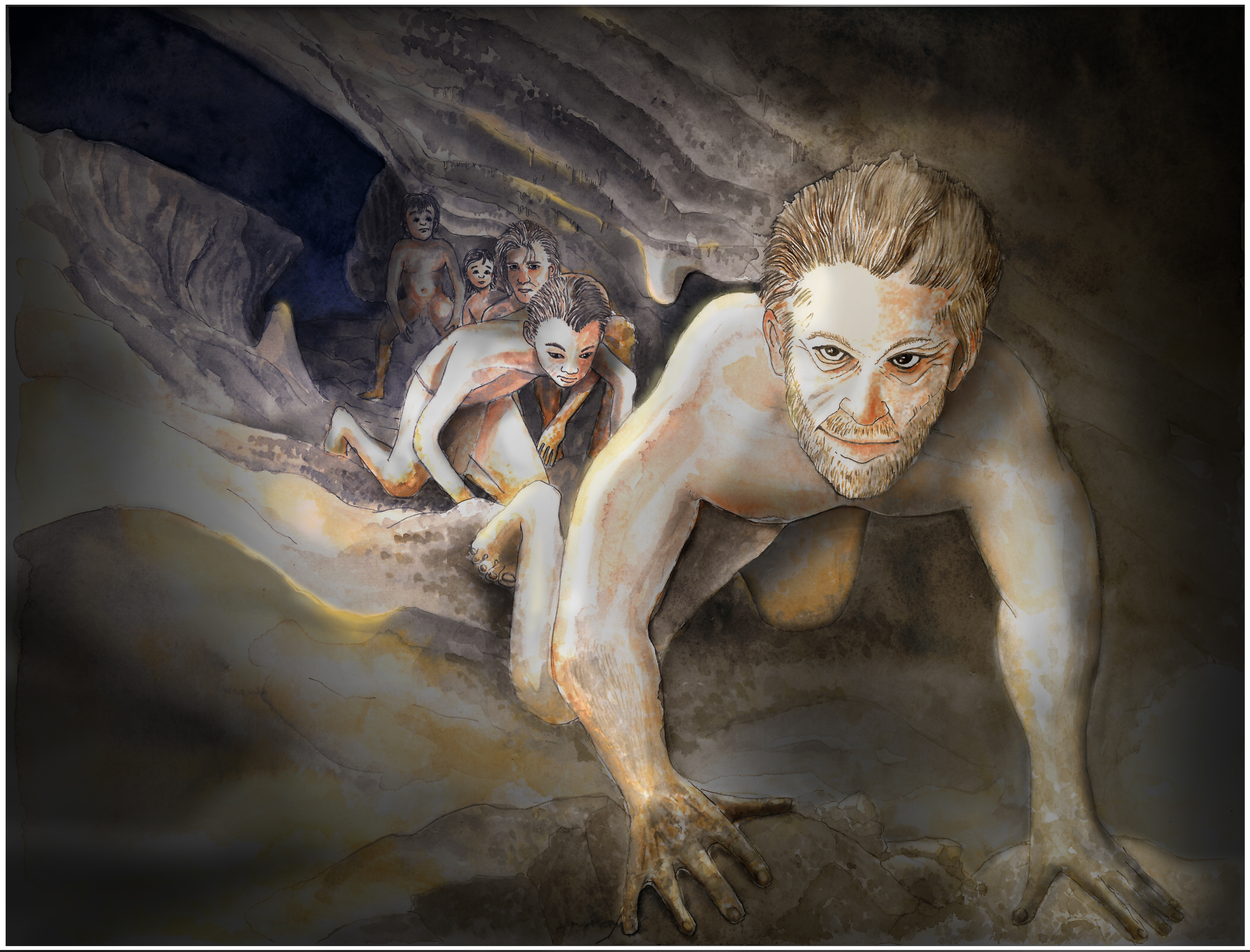 Ricostruzione ideale basata sulle tracce del corridoio delle impronte dell’attraversamento del cunicolo più basso della grotta (disegno Marco Avanzini)