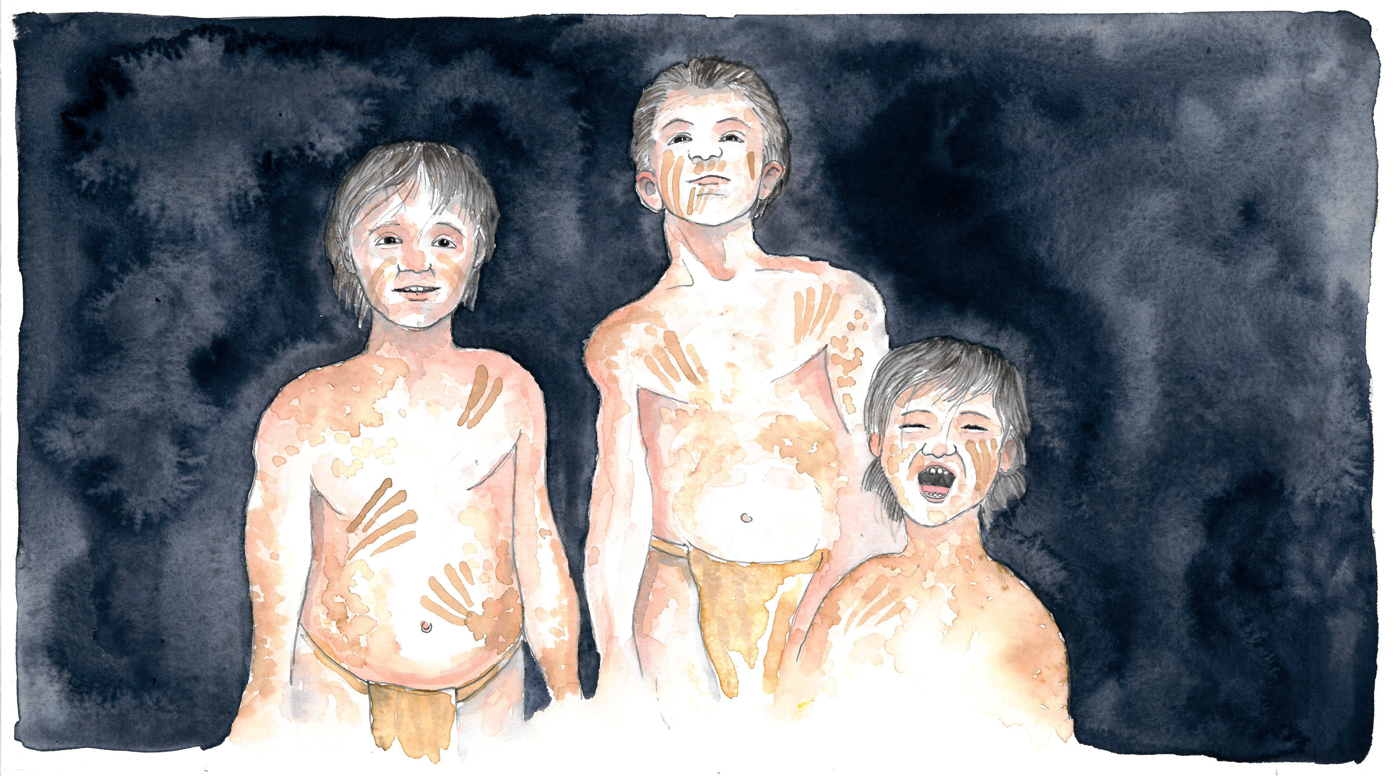 Ricostruzione dei tre bambini che arrivarono nella sala dei Misteri: un adolescente di circa 12 anni, un bambino di 7 e uno di 3/4 (disegno Marco Avanzini)