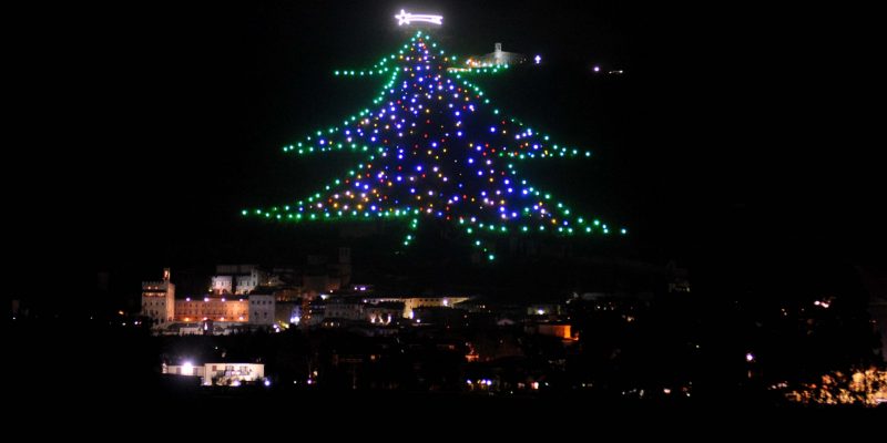 Gubbio, la cittadina umbra famosa per le vicende legate ad lupo particolarmente mansueto, da un po’ di anni sta conquistando l’attenzione generale in dicembre per un particolare allestimento. Si tratta del gigantesco albero di Natale che viene realizzato sulle pendici del Monte Ingino, che sovrasta la città. Gli organizzatori spiegano che è composto da oltre 700 maxi gruppi di sezioni illuminanti, è alto 475 metri ed occupa uno spazio di 130 mila metri quadri. La creazione parte dalle mura della città medievale e arriva alla fino alla Basilica di Sant’Ubaldo, posta in cima alla montagna. Per avere un’idea dell’impegno che richiede l’allestimento, diciamo che sono conteggiate 1.300 ore di lavoro; sono oltre 300 i punti luminosi di colore verde che delineano i contorni dell’albero mentre il corpo centrale è colorato da oltre 400 luci multicolore.