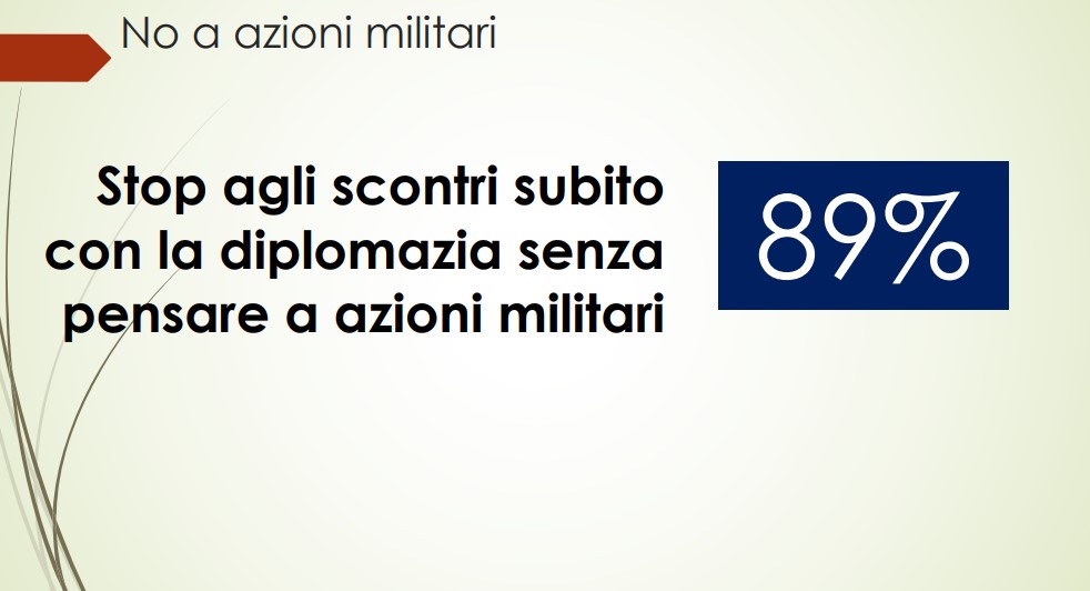 Secondo i dati presentati dalla Lega, l’89% degli italiani dice “stop agli scontri subito con la diplomazia senza pensare a azioni militari. L’87% del campione chiede una de escalation e che sia l’Onu a occuparsi del conflitto. Oltre il 90% la quota di chi vuole una riduzione delle armi nucleari, mentre l’80% si dice favorevole all’ingresso dell’Ucraina nell’Unione europea. Bene le sanzioni alla Russia per l’82% degli intervistati. Il sondaggio è stato svolto il 28 febbraio su un campione di 500 persone.