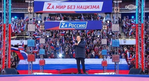 A Mosca clamoroso bagno di folla per Vladimir Putin. Lo Zar è apparso allo stadio Luzhniki in occasione dell’ottavo anniversario dell’annessione della Crimea alla Russia. La sede della finale del Mondiale 2018 era gremito: oltre 100 mila le persone presenti con migliaia di bandiere russe.