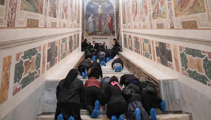 ROMA. Dopo 300 anni la Scala Santa, uno dei luoghi sacri di Roma più cari da sempre alla devozione cristiana, torna visibile nella sua bellezza originaria, liberata della copertura di legno voluta nel 1723 da Papa Innocenzo XIII. Sono 28 i gradini di marmo che, secondo la tradizione, Gesù salì, arrivando all’aula del palazzo di Gerusalemme dove Pilato lo condannò a morte. Fino a Pentecoste quando verranno nuovamente coperti, potranno essere ammirati per 60 giorni. Nella cerimonia di apertura straordinaria della Scala Santa, accanto alla Basilica di San Giovanni, sono stati presentati i restauri dei gradini e degli affreschi cinquecenteschi a cura dei laboratori dei Musei Vaticani. Dopo la benedizione, i fedeli si sono messi in fila per salire in ginocchio la Scala.