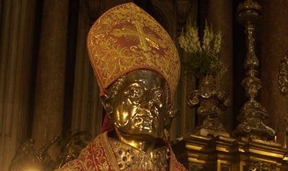 NAPOLI. Cosa c’è di più prezioso per i napoletani della loro squadra di calcio? Sicuramente san Gennaro, vescovo e martire cristiano, patrono della città di Napoli. Nel duomo si custodiscono le ossa del santo, oltre a due antichissime ampolle, contenenti il suo sangue raccolto dalla nutrice dopo il martirio, esposte alla venerazione dei fedeli tre volte l’anno: il sabato precedente la prima domenica di maggio, il 19 settembre, e il 16 dicembre. In quei giorni è possibile assistere al fenomeno della liquefazione, attestata per la prima volta nel 1389 come fatto già noto e considerato dalla pietà popolare un miracolo.