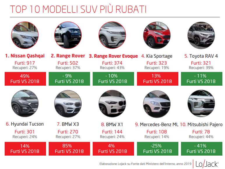 I dati della Top Ten evidenziano il boom del Nissan Qashqai (917 unità sottratte e + 49% rispetto al 2018) che si conferma SUV più ricercato. Nella top 5 dei più rubati è seguito da Range Rover Sport (502), Range Rover Evoque (374) Kia Sportage (323) e Toyota RAV 4 (321).