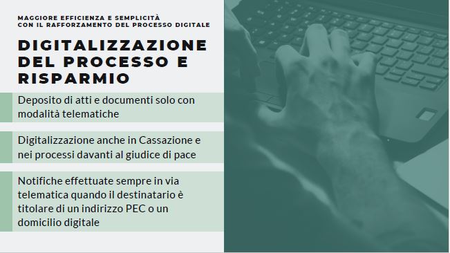 Il testo contiene delle novità importanti in materia di disciplina del processo civile, nel quale sono contenute disposizioni che puntano alla semplificazione, rapidità e razionalizzazione delle procedure, garantendo il pieno rispetto delle garanzie del contraddittorio.