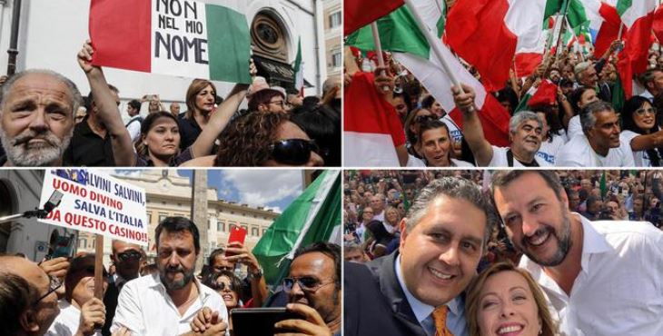 In piazza con i due leader c’era anche il governatore della Liguria, Giovanni Toti, mentre i parlamentari di Forza Italia hanno scelto di fare opposizione al nuovo governo Conte dentro le Aule parlamentari. Intanto, quattro deputati “totiani” hanno lasciato il Gruppo di Fi alla Camera (si tratta di Stefano Benigni, Manuela Gagliardi, Claudio Pedrazzini, Alessandro Sorte): andranno al Gruppo Misto non avendo i numeri per formare un gruppo autonomo.
