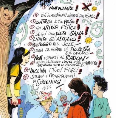 Non fumare, fare attività fisica, seguire una sana alimentazione, evitare gli alcolici e aderire ai programmi di vaccinazione adolescenziale per l’epatite B e il papillomavirus: sono solo alcune delle 12  Regole, protagoniste della “guida” in formato graphic novel, ideata da Maurizio Rosenzweig, uno dei più apprezzati fumettisti italiani, scaricabile gratuitamente dal sito web www.reteoncologica.it/graphic-novel-il-segreto-delle-12-regole, dove è possibile trovare anche tante informazioni sulla prevenzione oncologica e mettersi alla prova con i quiz di autovalutazione.