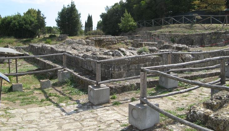 In pochi minuti si arriva in cima al colle dove, situato ad una delle estremità del parco Enrico Fiumi vicino alla fortezza medicea, possiamo visitare la necropoli etrusca. Nell’area sono inclusi edifici di varie epoche: da quella etrusca a quella romana e medievale, tutti realizzati a scopo religioso. Vi sono i resti di una cisterna di raccolta dell’acqua piovana, di una piscina augustea e di due edifici a forma di tempio soprannominati A e B: il primo rettangolare risale al II° secolo AC, mentre il secondo al III° secolo DC, caratterizzato da un palco con colonne.