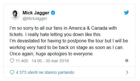 Lo stesso Jagger, in una dichiarazione su Twitter, si è detto dispiaciuto della cancellazione: “Odio deludere I miei fan e sono profondamente deluso di dover rinviare il tour, ma non vedo l’ora di tornare sul palco appena sarà possible”.
