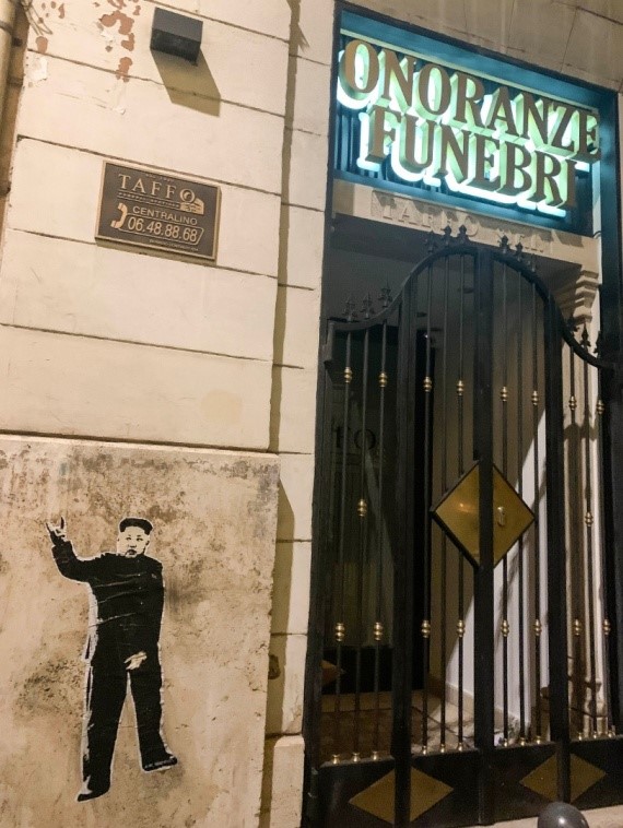 ROMA. “Una risata vi seppellirà” recitava un vecchio slogan. E anche questa volta l’ironia la fa da padrona. Il leader della Corea del nord Kim Jong-un torna protagonista sui muri di Roma, con un gesto scaramantico, vicino alla sede di una nota agenzia di pompe funebri della capitale. E’ l’ultima opera della street artist Laika.