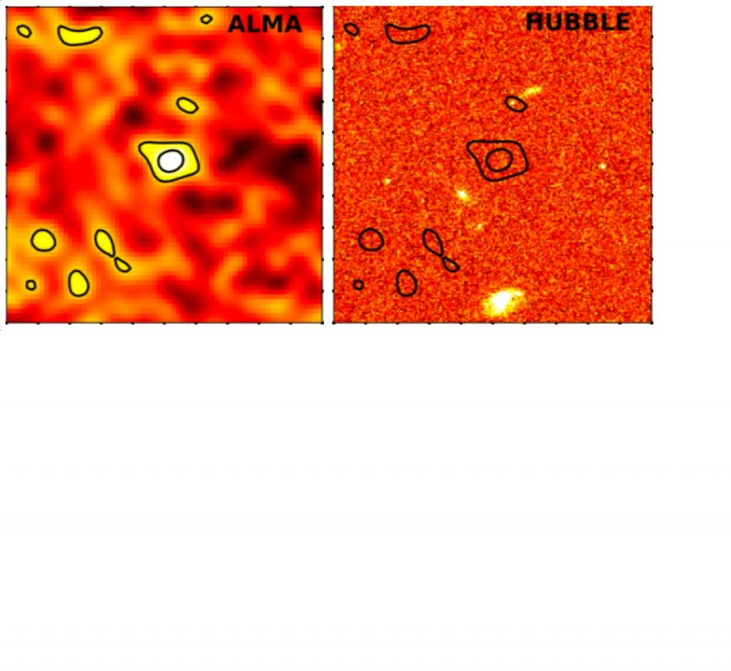 Con ALMA il team ha scoperto alcune galassie distanti che non erano mai state viste prima, ribattezzate “Hubble-dark”. Le galassie “Hubble-dark”, rivelate fortuitamente nei campi ALPINE, sono così chiamate perché sono invisibili persino nelle immagini più profonde con l’Hubble Space Telescope, sempre per il fatto dell’abbondanza di polveri presenti in esse che blocca gran parte della loro luce.