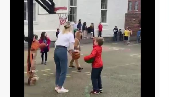 Miss Fitz aveva promesso a tutti i bambini di offrire una tazza di cioccolata calda nel caso in cui fosse riuscita a realizzare un canestro da metà campo. Il tiro da tre impossibile le riesce e la reazione da parte dei bimbi presenti è stata incontenibile.