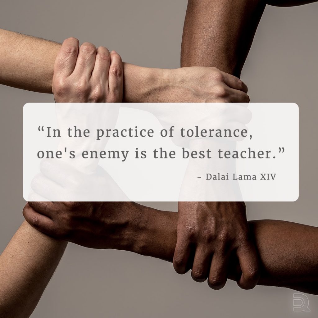 In altre parole, anche se non si condividono gli stessi pensieri o le stesse opinioni, ciò non toglie che vi deve essere rispetto tra le persone in quanto tali. Questo però non vuol dire che qualsiasi comportamento deve essere accettato, l’Unesco infatti spiega che tolleranza non significa tollerare l’ingiustizia sociale o rinunciare alle proprie convinzioni.