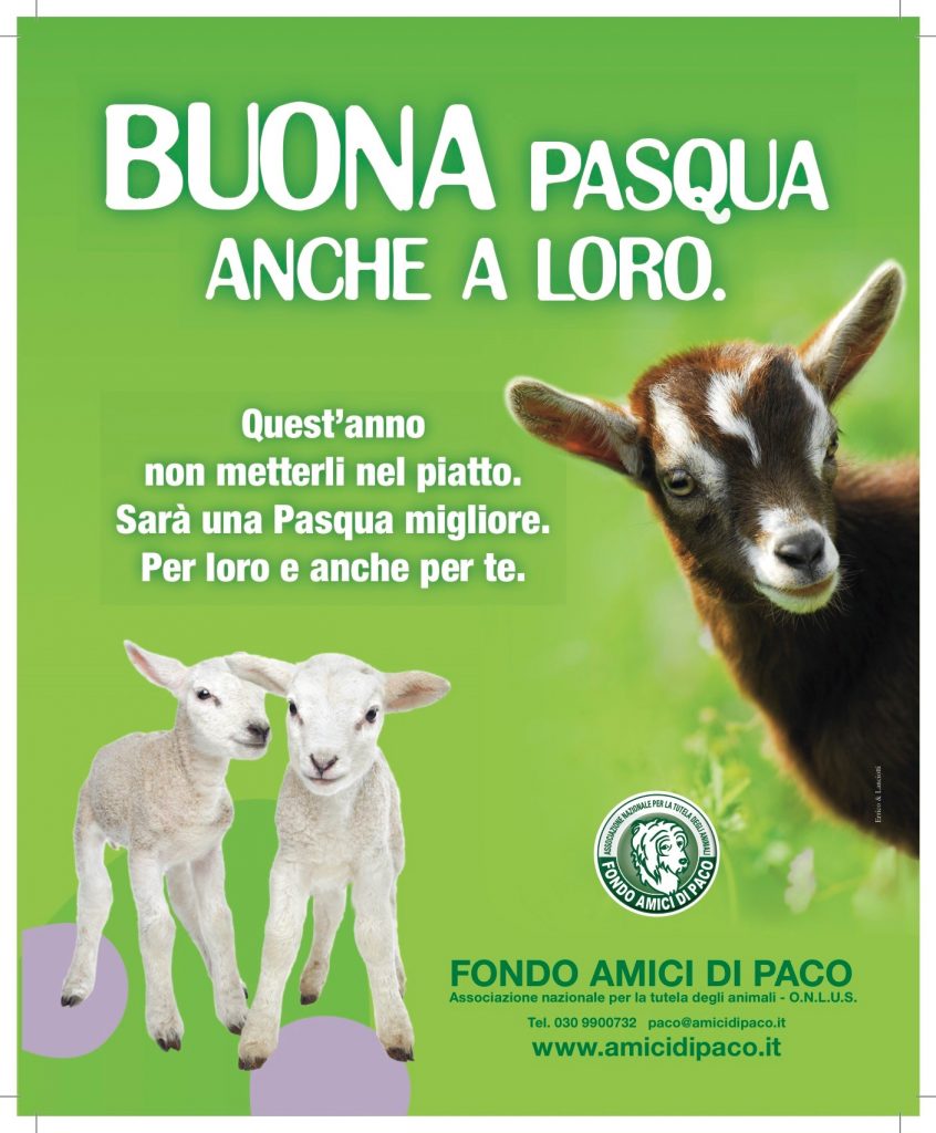 Quest’anno, oltre alla tradizionale campagna “Buona Pasqua anche a loro”, Diana Lanciotti, giornalista, scrittrice e fondatrice del Fondo Amici di Paco, ha voluto riproporre il manifesto “Lasciamoli vivere… meglio vivi che nel nostro piatto” da lei stessa ideato dopo un’esperienza vissuta un paio d’anni fa, che ha così descritto: “Sabato mi sono regalata una gita in campagna, immergendomi nell’ambiente rilassante e di una dolcezza struggente dell’Anglona, che in questa stagione è verdissima. C’erano numerose greggi al pascolo e mi sono fermata a osservare i giochi degli agnellini, le corse e i salti. Le pecore adulte, appena mi vedevano avvicinarmi, serravano i ranghi intorno ai piccolini, mentre i cani da pastore accorrevano per capire le mie intenzioni e farmi capire le loro. Poi, appena capivano che le mie erano assolutamente pacifiche, le pecore si tranquillizzavano e riprendevano a brucare, mentre i cani si rilassavano, pur rimanendo vigili. Ho scattato un po’ di foto, cogliendo attimi di infinita tenerezza. Il senso di serenità che ho provato è indescrivibile. Mancavano due settimane a Pasqua. Sono venuta via sapendo che, passando di nuovo di lì tra qualche giorno, non avrei più rivisto quei piccoli. Così ho deciso di rivolgermi direttamente a loro, come responsabili degli acquisti e della cucina, per farle riflettere mostrando loro momenti di intimità tra mamma pecora e figlio agnellino, momenti non tanto diversi da quelli che ogni mamma umana vive con i propri bambini. Da tempo sono convinta che se i bambini, e anche le mamme che fanno la spesa e poi cucinano, facessero il collegamento tra gli animali vivi e quel trancio di carne che finisce in pentola forse cambierebbero abitudini alimentari. Perché alla fin fine si tratta di pure e semplici abitudini, unite spesso alla mancanza di approfondimento, di fantasia e di voglia di trovare delle alternative”.