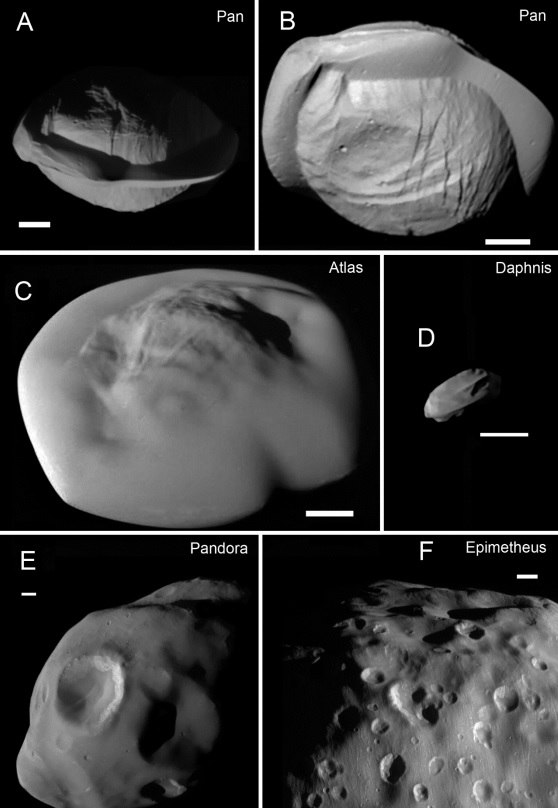 I risultati sono stati ottenuti tra dicembre 2016 e aprile 2017, durante la fase cosiddetta “ring-grazing”, cioè le 20 orbite vicine al bordo esterno degli anelli. Il dottor Filacchione ha spiegato che: “Alcune di queste lune, come Pan e Dafni che orbitano nelle zone vuote (le cosiddette gap) dell’anello A e Atlante subito al di fuori di esso, mostrano forme peculiari con un nucleo irregolare centrale e una cintura di accrescimento lungo il piano equatoriale dove le particelle sottratte dai vicini anelli si accumulano preferenzialmente. Il resto delle loro superfici appare relativamente liscio, con pochi e piccoli crateri da impatto mentre estese fratture e scarpate testimoniano gli effetti delle accelerazioni mareali causate dal campo gravitazionale di Saturno su questi corpi irregolari con il conseguente riposizionamento del materiale accumulato nelle cinture equatoriali”. Durante questa breve ma intensa campagna osservativa, la sonda Cassini si è dedicata anche a Pandora, uno dei satelliti “pastore” dell’anello F, e a Epimeteo, co-orbitante con Giano. Filacchione ha concluso affermando: “Grazie all’elevata risoluzione (fino a 36 metri per pixel) delle immagini raccolte, le superfici di queste due lune mostrano numerosi crateri di impatto. In genere tutti questi corpi hanno delle densità molto basse, tra i circa 300 e 500 chilogrammi per metro cubo, che le rende quindi molto porose e poco compatte”. Come paragone, la densità dell’acqua sulla Terra è di 1000 chilogrammi per metro cubo.