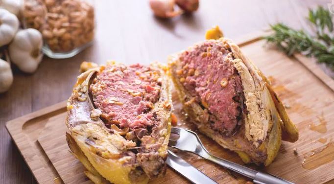 Coprite con coperchio e lasciate cuocere a fuoco molto basso per almeno 2 ore. Se possedete un termometro da cucina per una maggiore precisione sulla cottura saprete che il cappone sarà prono quanto raggiungerà gli 80°C. Alternativamente potete utilizzare uno spiedino da cucina: se punzecchiandone le carni osserverete uscire un liquido chiaro il cappone sarà cotto, se il liquido è rosato allora il cappone necessita di prolungare la cottura. Il cappone ripieno è quindi pronto e può essere tagliato per essere gustato.